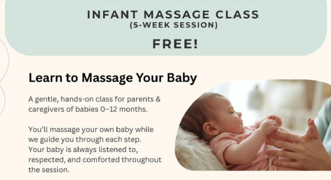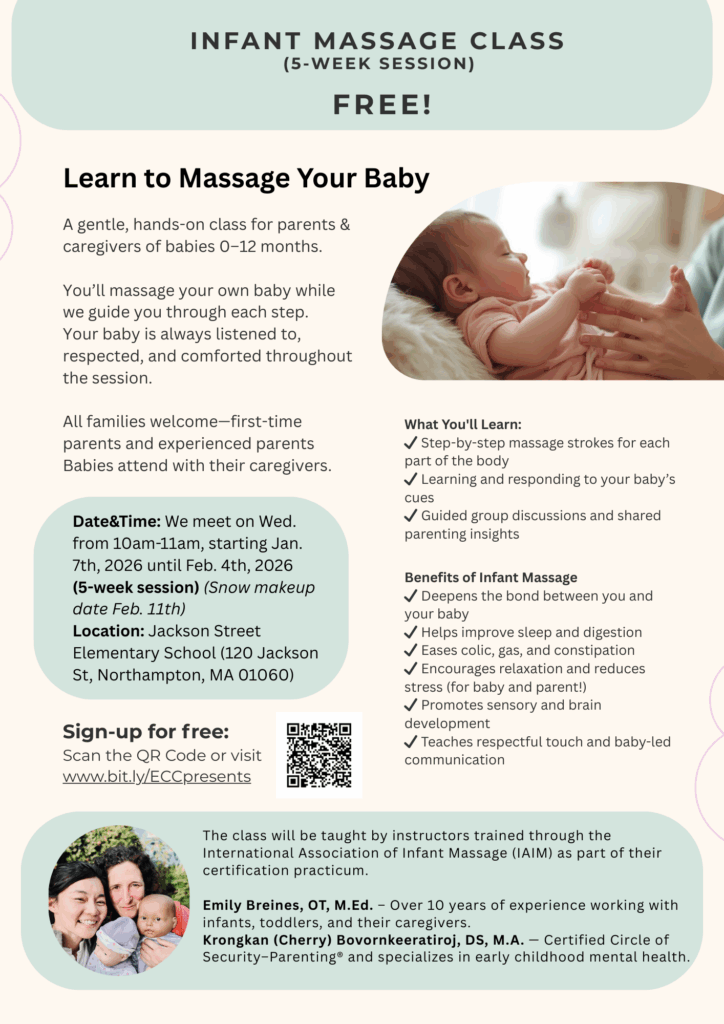 Northampton Public Schools Early Childhood Center (ECC) is holding a FREE 5-week workshop: Infant Massage Class. The class will be a gentle, hands-on class for parents & caregivers of babies 0 – 12 months. All families welcome – babies attend with their caregivers. More information on the flyer below, or download here.