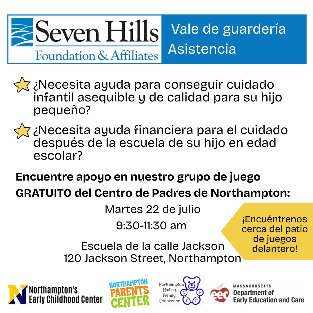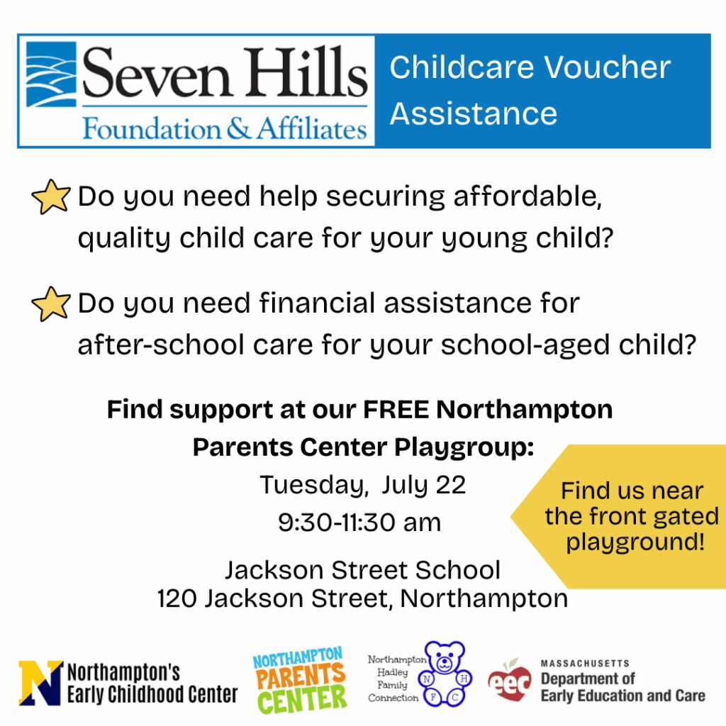 Elizabeth Vega from Seven Hills will be visiting NPC’s summer playgroup on Tuesday, July 22. Elizabeth will share Seven Hills as a resource for families and assist with childcare voucher enrollment. Come play and get information about childcare vouchers and Seven Hills’s other programs.