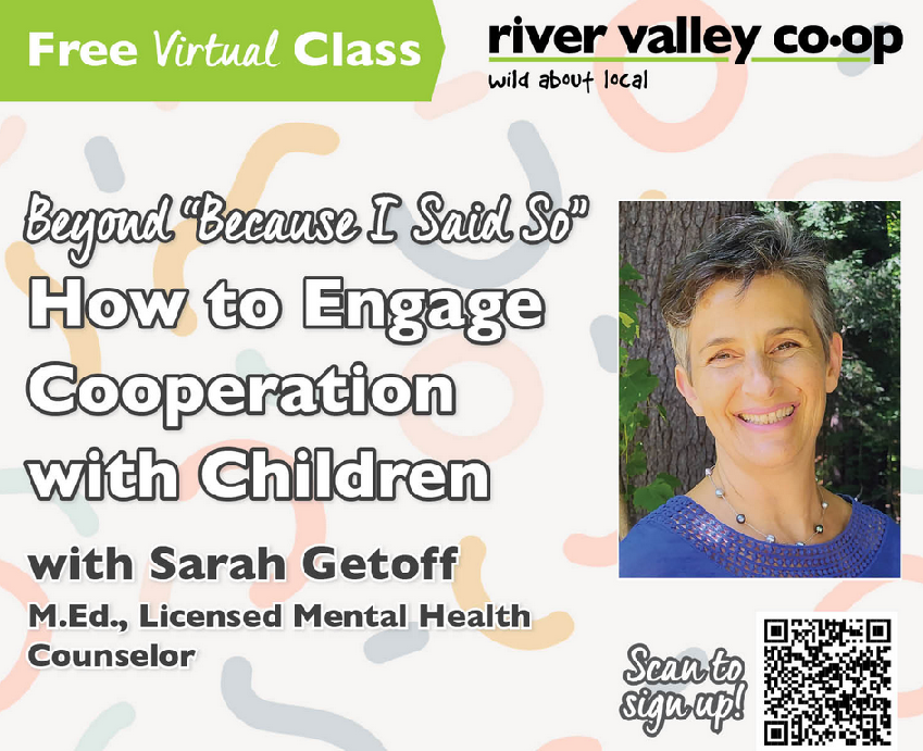 River Valley Coop is hosting a FREE virtual parenting seminar on Wednesday, September 17, 7:00 pm: Beyond “Because I Said So”: How to Engage Cooperation with Children.